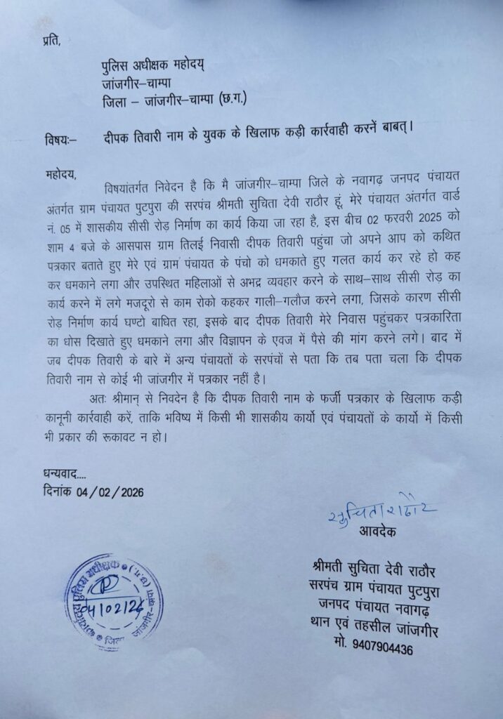 Janjgir-Champa : A serious मामला of alleged extortion and obstruction of government work under the guise of journalism has surfaced in Janjgir-Champa district. Public representatives of Gram Panchayat Putpura, under Nawagarh Janpad Panchayat, submitted a written memorandum to the Superintendent of Police seeking legal action against a youth accused of misusing the name of journalism.