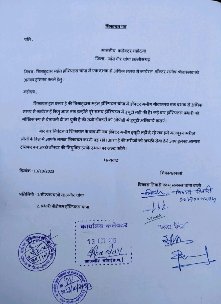 This is not the first time Dr. Manish Shrivastava’s name has figured in official complaints. During his earlier posting at BDM Hospital, Champa, local residents had submitted written representations to the district administration alleging irregular attendance at the outpatient department, resulting in inconvenience to patients.