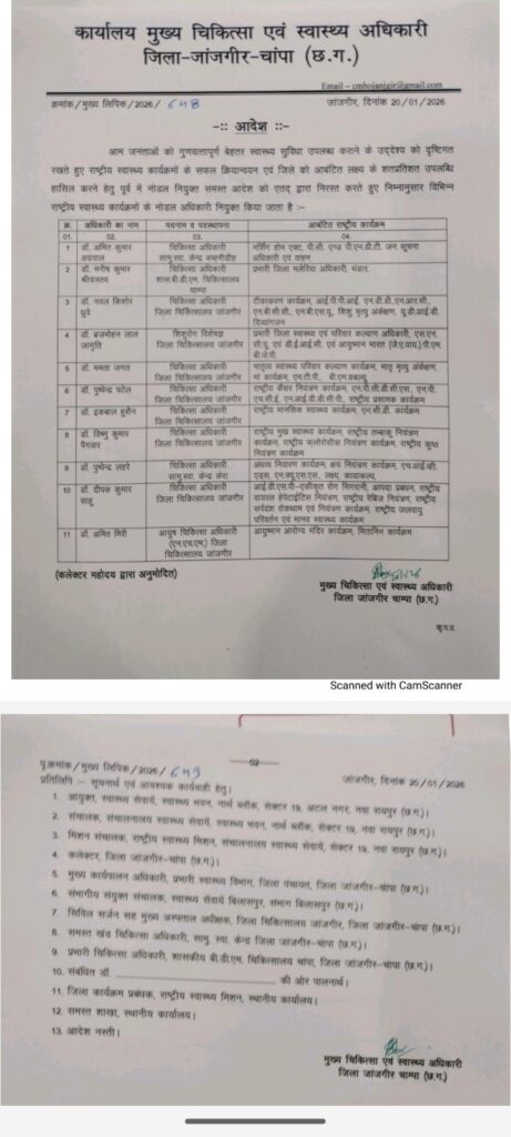 Dr. Anita Shrivastava assumed charge as In-charge CMHO on January 5, 2026, following her transfer from BDM Hospital, Champa. Within a fortnight of taking office, an order was issued attaching Dr. Manish Shrivastava to the district headquarters and appointing him as In-charge District Malaria Officer as well as District Store/Medical Supplies In-charge.